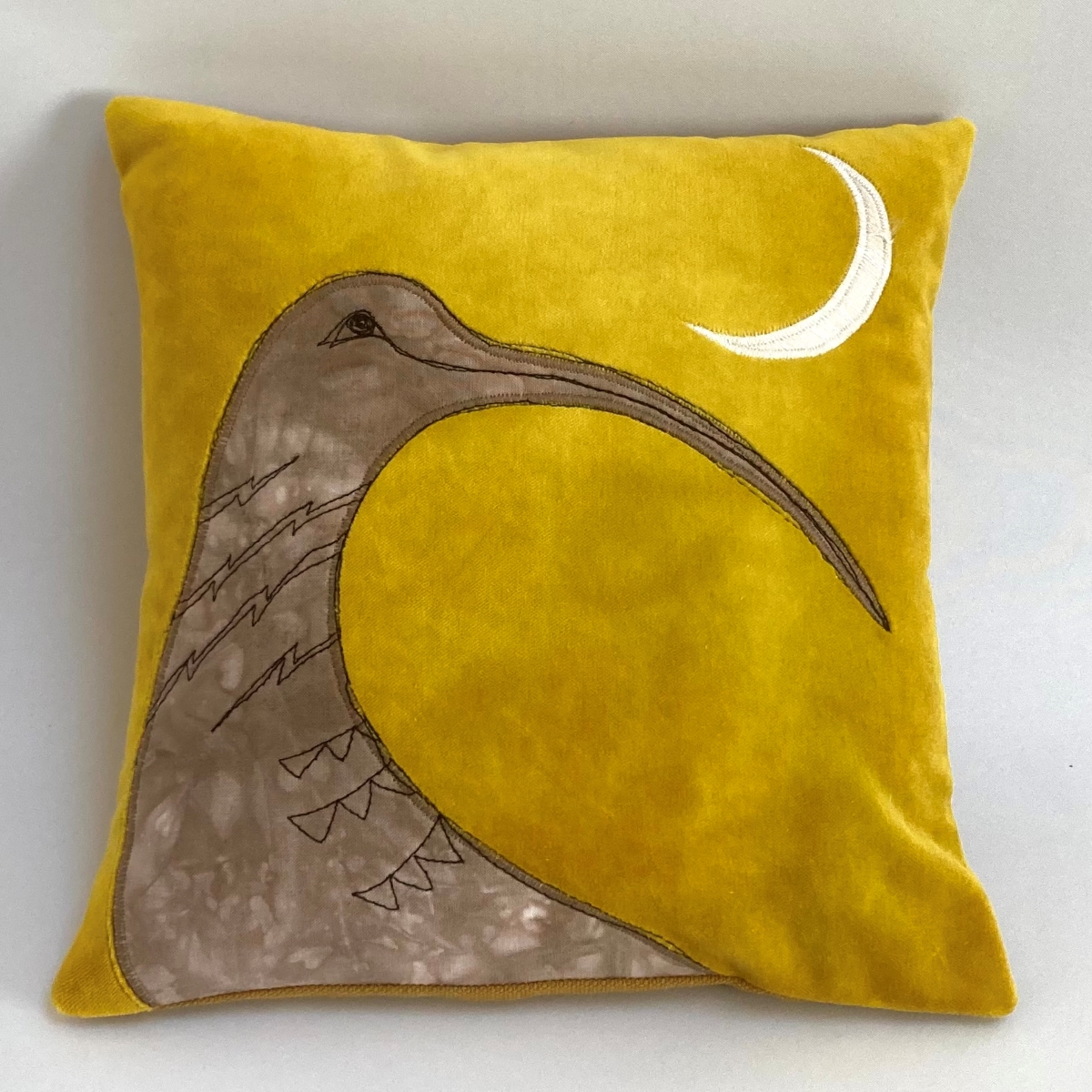 Dyed velvet with cotton appliquéd curlew and silk new moon. Plain cotton envelope style back.