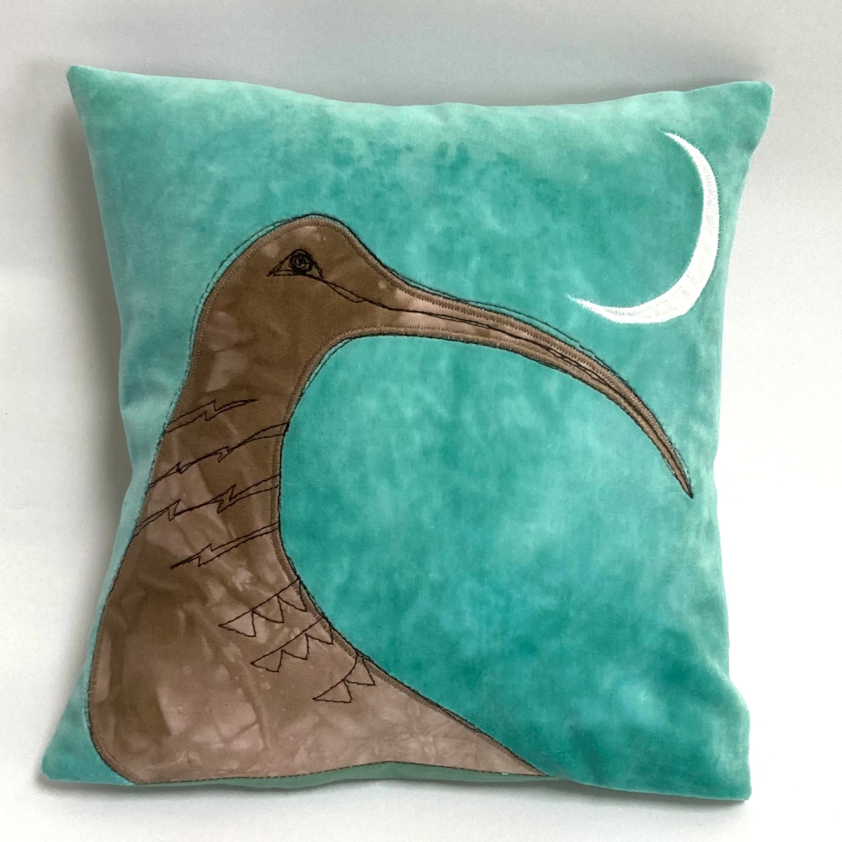 Dyed velvet with cotton appliquéd curlew and silk new moon. Plain cotton envelope style back.