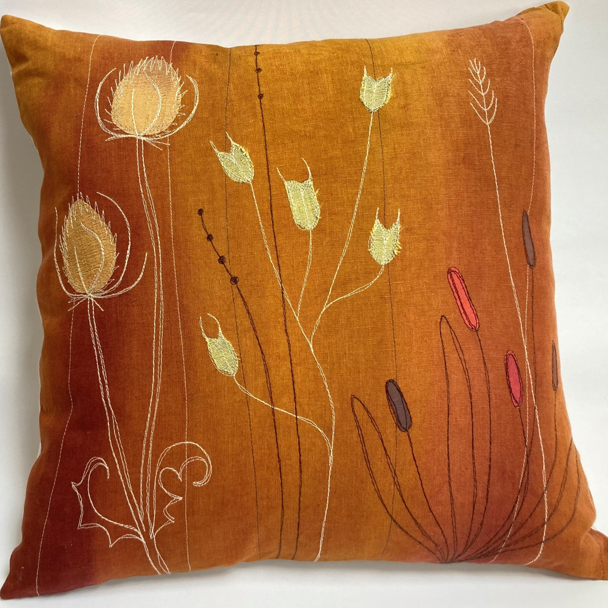 Dye-painted linen with wildflowers and grasses in stitching and silk. Plain linen back with a zip fastener.