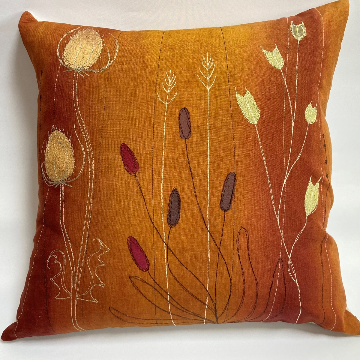 Dye-painted linen with wildflowers and grasses in stitching and silk. Plain linen back with a zip fastener.
