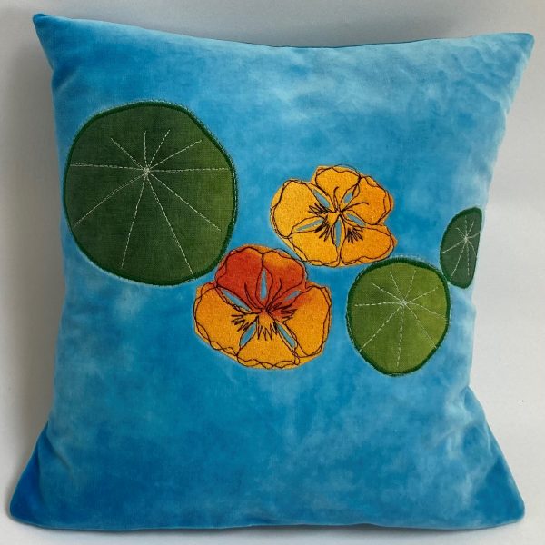 Dyed velvet with appliquéd dyed silk and linen nasturtiums. Plain cotton envelope style back.