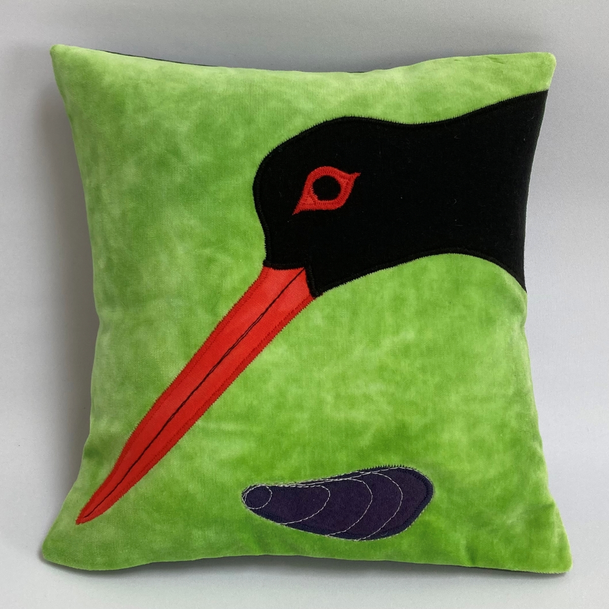 Dye-painted velvet with cotton appliquéd oystercatcher. Plain cotton envelope style back.