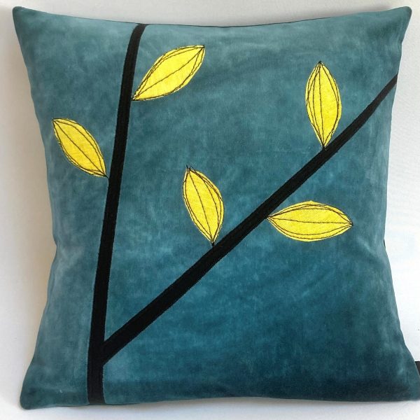 Dyed velvet with cotton and dyed linen appliqué.  Plain cotton envelope style back.
